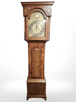 A 19th century inlaid mahogany eight day longcase clock with pendulum and weights, later movement, height 208 cm