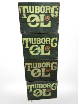 Four vintage painted pine Tuborg bottle crates, width 48 cm.