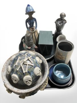 Scandinavian studio pottery bowls, vessels, globular ornament decorated with skulls, etc.