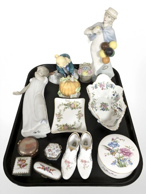 A group of figurines including Royal Doulton Covent Garden HN 2857, Coalport Christmas Glee, limited edition of 1500, Nao figure of a girl and cabinet china including Spode trinket box, Del Prado pill boxes, Aynsley dish etc