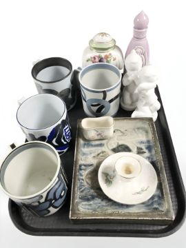 A group of Royal Copenhagen Fajance pottery, Bing and Grondhal candleholder, pair of baby figurines etc