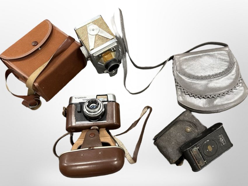 A Voigtlander Vitoret camera, a Kodak camera, one other, and a Charles Jourdan lady's grey leather handbag