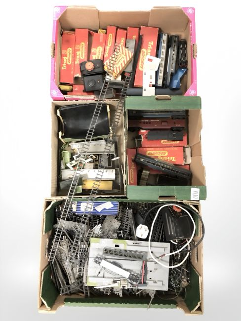 A quantity of Triang OO gauge railway rolling stock, track, control units, buildings, etc. (4 boxes)