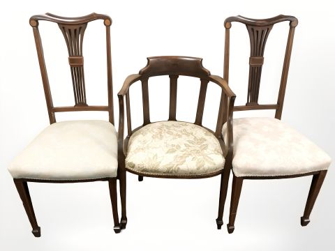 A pair of inlaid mahogany salon chairs and a further armchair.
