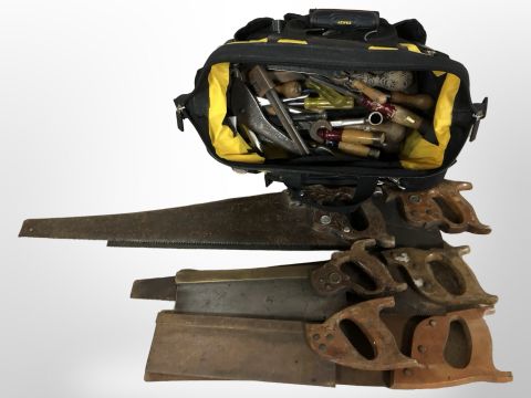 A Stanley tool bag, vintage hand saws and carpentry tools