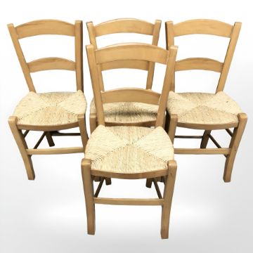 A set of four rush seated dining chairs.