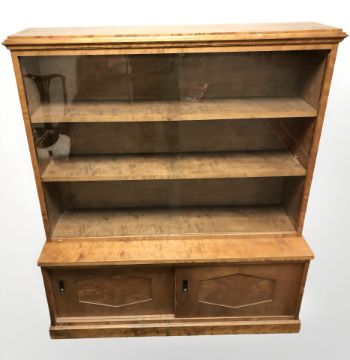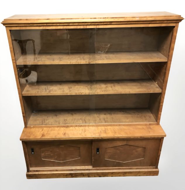 A continental stained birch sliding glass door bookcase, with cupboard beneath, 133 cm x 45 cm x 150 cm.