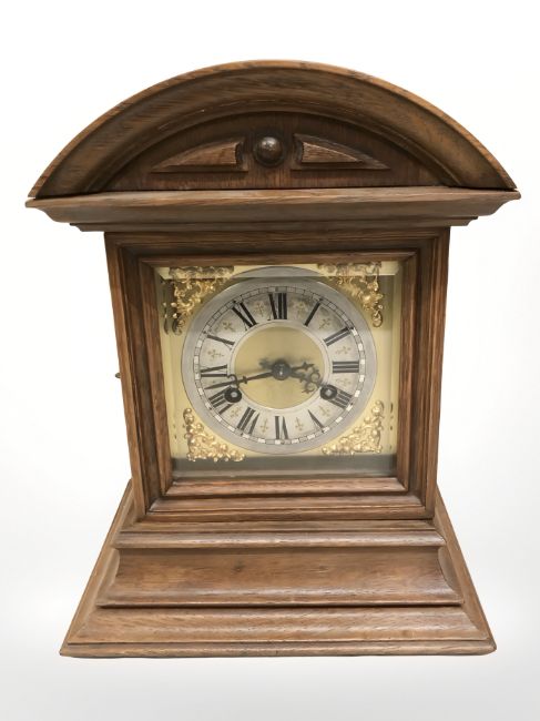 An Edwardian oak bracket clock, height 32 cm.