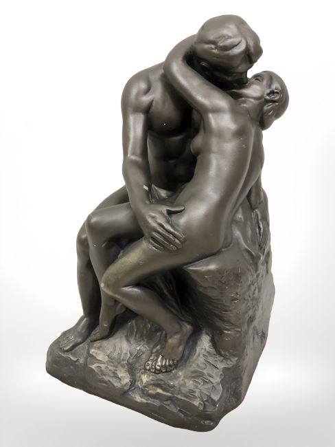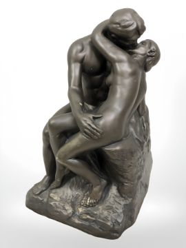 A contemporary bronze effect figure depicting lovers on wooden plinth, height 30 cm.