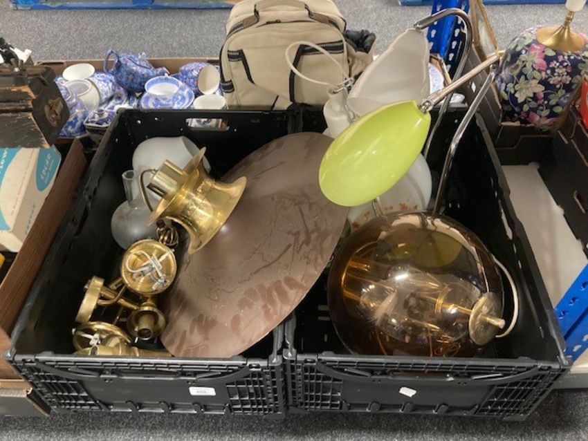 A group of table lamps and pendant light fittings, etched glass oil lamp shade, wall sconces. (2 boxes)