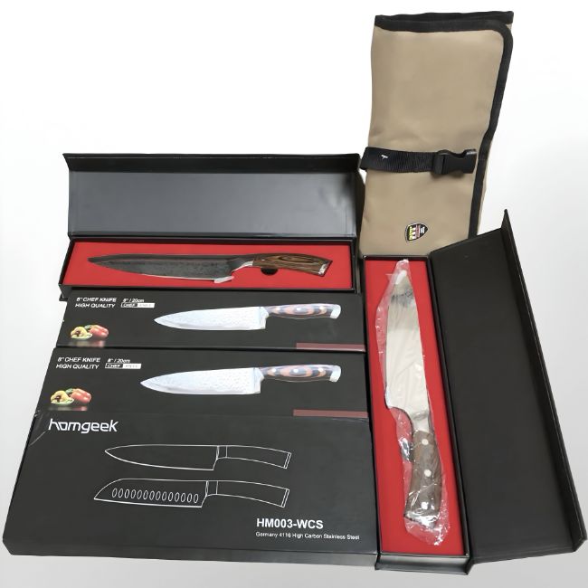 Two Hobo 8" chefs knives, a further Homgeek two piece knife set, two further culinary knives, all parts boxed, and a further satchel containing a part set of stainless steel cooking utensils.