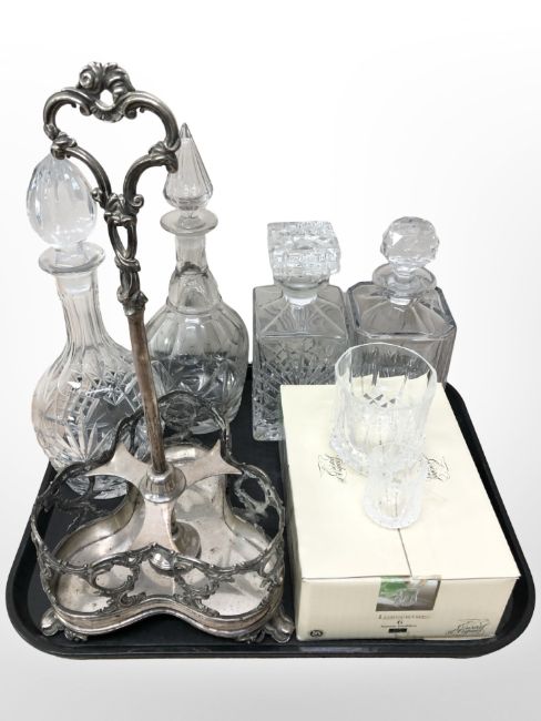 An EPNS bottle stand, four various decanters, set of six Cristal D'Arques liqueur tumblers.