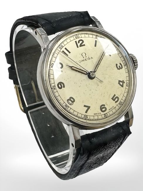 A gent's vintage stainless steel Omega manual-wind wristwatch, circa 1939, silvered dial with centre seconds and Arabic numerals, Omega crown, snap-on case back numbered 10414756 to interior, 18 jewel movement numbered 9,650,258, case 30mm.