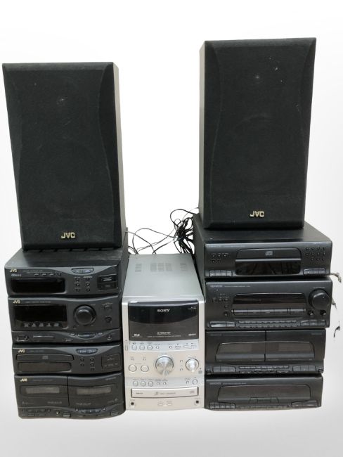 A Kenwood four piece hi/fi system, further JVC four piece system and speakers, plus a Sony micro hi/fi system