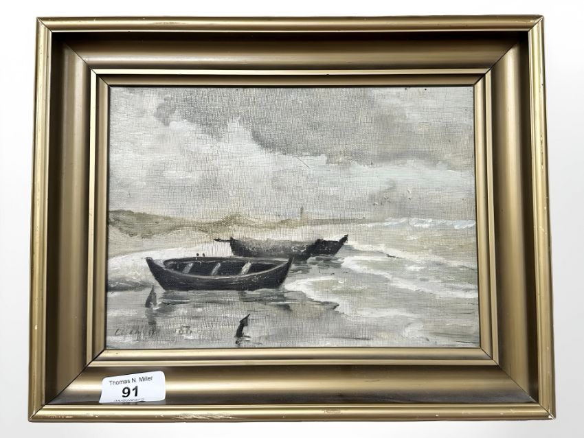 C Kristensen : Rowing boats on a beach, oil on board, 23 cm x 16 cm.