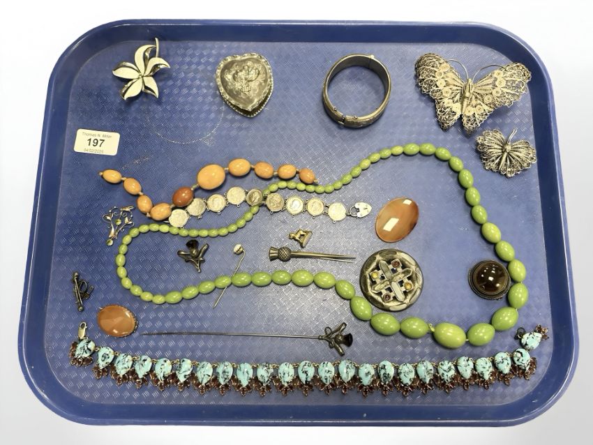A Sterling silver Norwegian enamel brooch, together with silver bangle, amber beads, filigree brooches, Edwardian 9ct gold pendant, antique silver three pence piece bracelet, silver heart shaped trinket pot etc (Q)