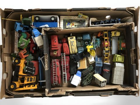 Assorted play worn die cast vehicles including Corgi and Dinky. (1 box)