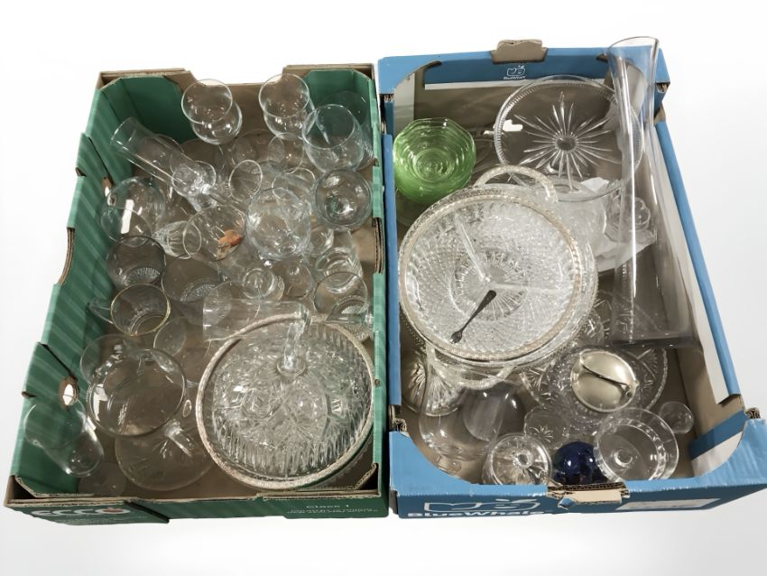 A quantity of drinking glasses, pressed glass bowls, paperweight etc (2 boxes)