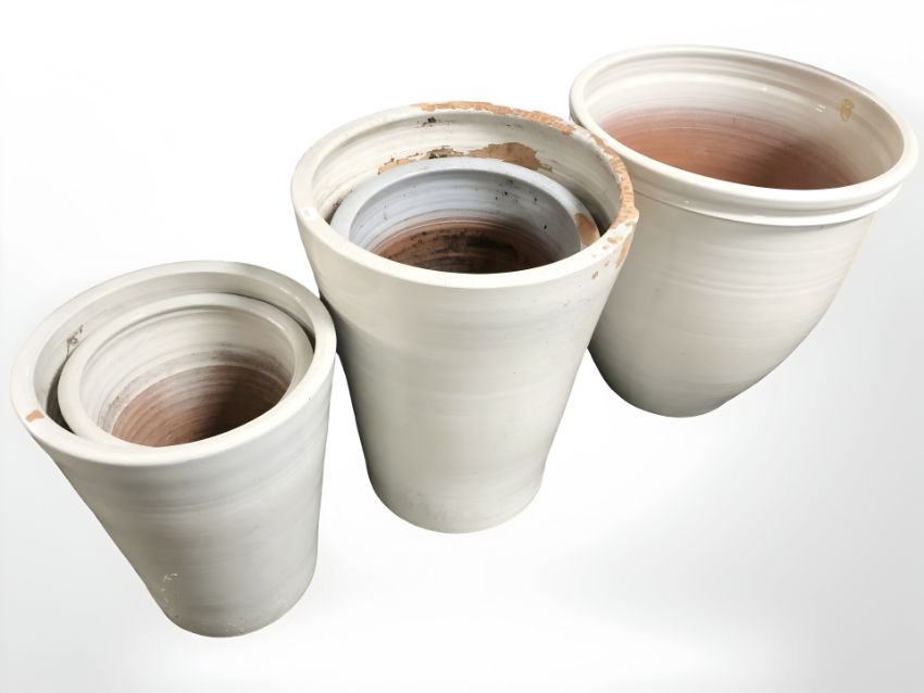 A group of ceramic plant pots, tallest 46 cm