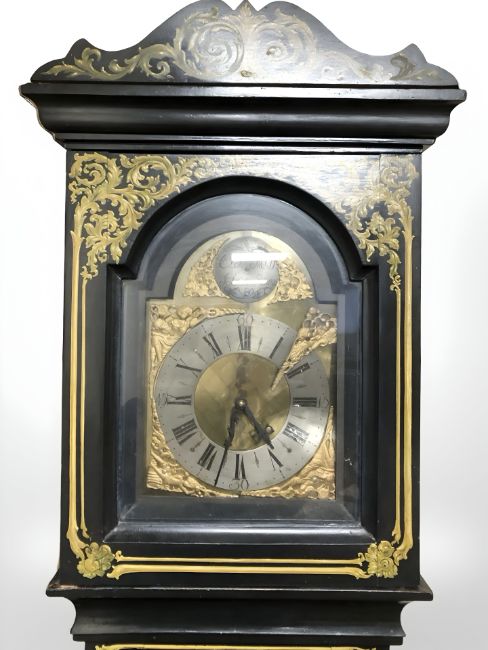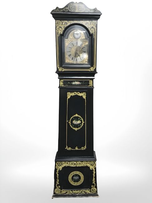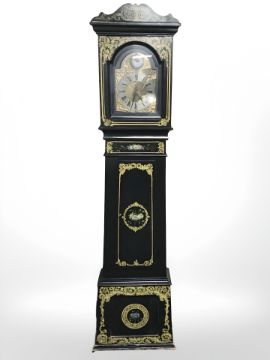 A continental ebonised and hand painted long case clock, height 205 cm.