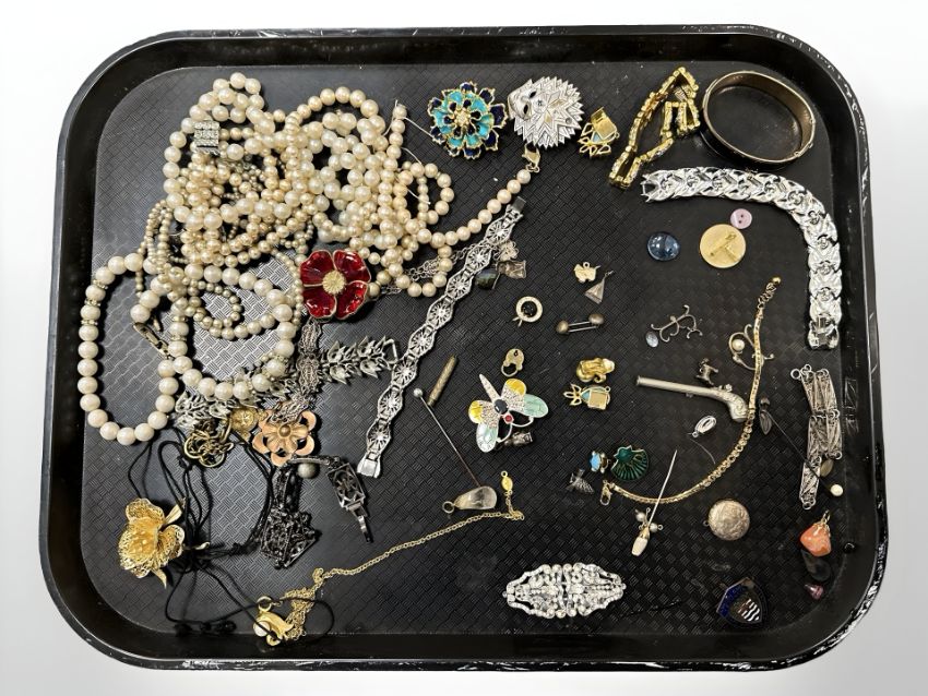 A group of vintage and later costume jewellery items, faux pearls, locket, bangle etc