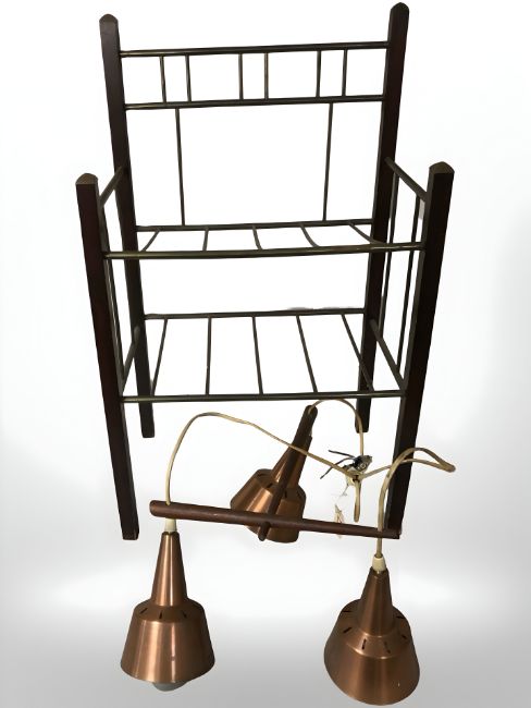 A brass shoe rack, width 43 cm and a Scandinavian teak and copper effect pendant light fitting
