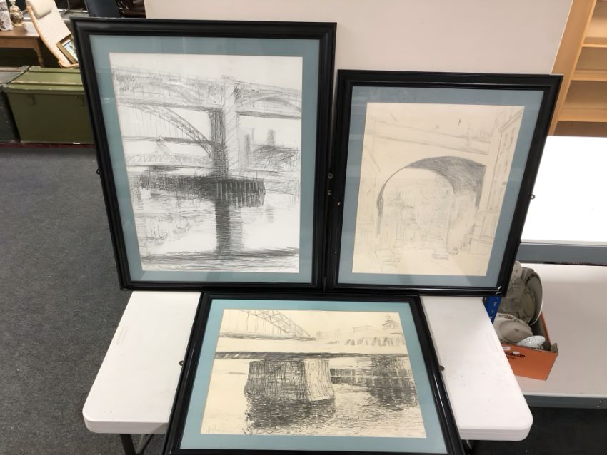 Three pencil sketches of bridges over the Tyne, indistinctly signed, largest 70 cm x 52 cm.