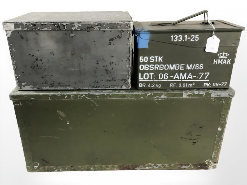 Three 20th century Danish military storage boxes, largest 67 cm wide.