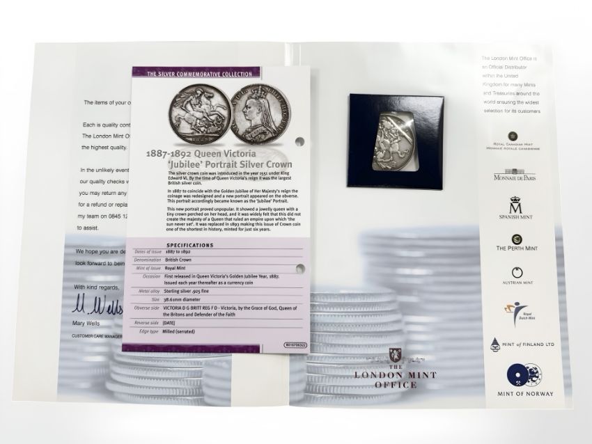 The London Mint Collection : A Queen Victoria 1889 'Jubilee' portrait Sterling silver crown, with certificate of authenticity.