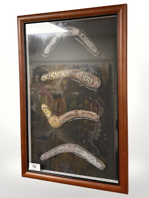 A collage of four miniature aboriginal boomerangs, 33 cm x 49 cm.