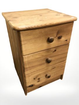 A pine three drawer bedside chest, width 43 cm