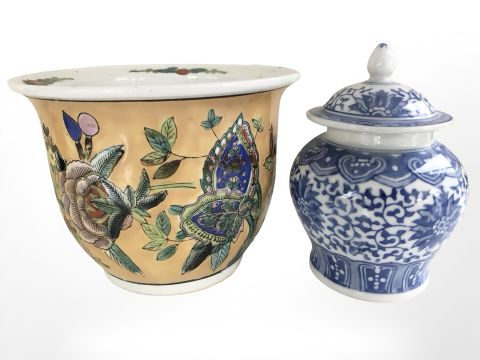 A 20th century Chinese porcelain planter, height 13 cm, and a further contemporary Chinese blue and white lidded temple jar.