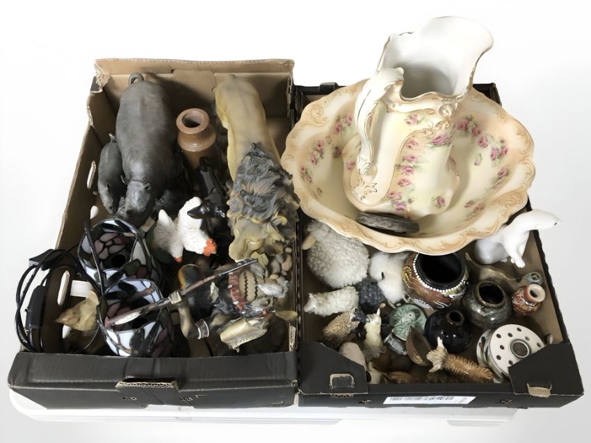 Assorted animal figurines, small pair of Tiffany style lamps, transfer printed wash jug and basin, etc. (2 boxes)