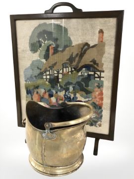 A tapestry fire screen and a Victorian brass coal helmet.