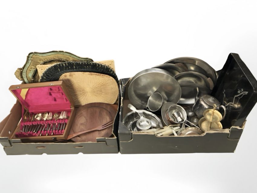 A group of stainless steel and other serving platters, further tablewares, oriental lacquered tray, canteen of cutlery, etc. (2 boxes)