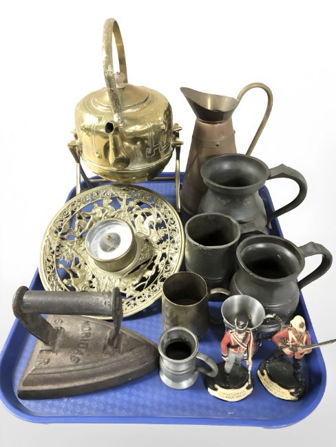 A brass spirit kettle on stand, barometer, pewter tankards, die cast figures of soldiers, etc.