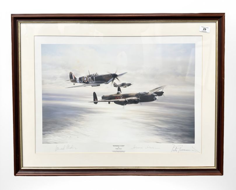After Robert Taylor : Memorial Flight, colour print signed by Leonard Cheshire, Johnnie Johnson and Peter Townsend, 61 cm x 43 cm