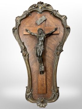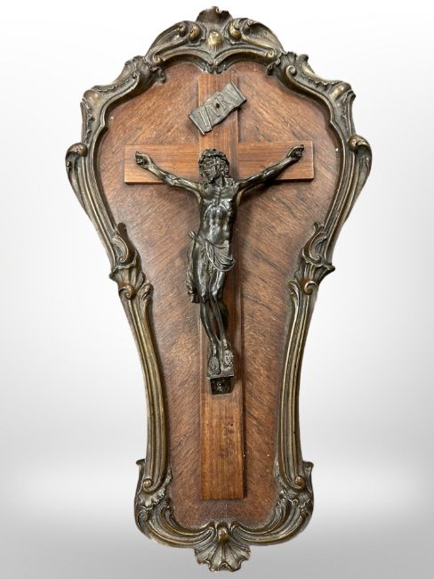 A bronze and rosewood crucifix, circa 1900, indistinctly signed, length 49cm.