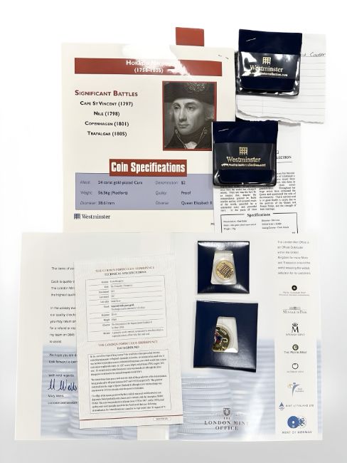A group of commemorative editions : The Changing face of Britain's coinage golden edition penny, 2006 Portrait Diamond Wedding One dollar, 1995 £2 celebration of fifty years of Peace Queen and Dove and The Great British Military Leaders Horatio Nelson Piedfort 24ct gold plated $2 coin.