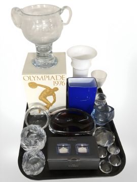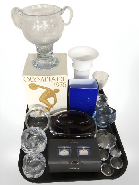 Scandinavian glass wares including Rosendhal glass tea light holders, bowls, vase, 1976 Olympics glass vase, etc.