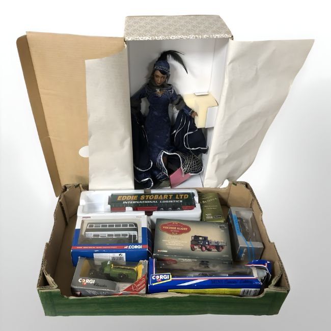 A group of boxed Corgi die cast vehicles, Frankin Heirloom doll, W. Britten figure, etc (one box)
