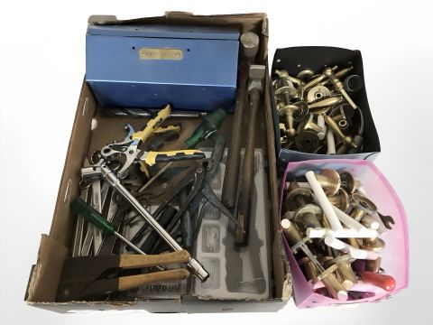 A small quantity of hand tools and brass door handles. (3 boxes)