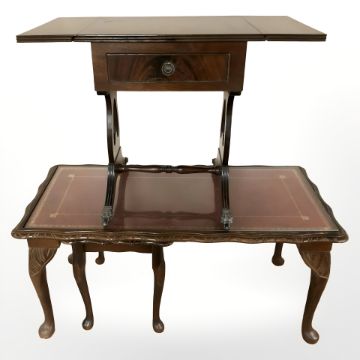 A reproduction coffee table with red leather inset panel and matching table beneath, further reproduction drop leaf table