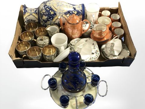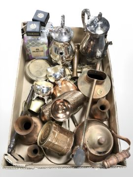 Assorted EPNS and copper plated metal wares, two Dissarno decanters (empty), Ridgeway Historic Castles wares, decorative pottery vase, glass ware etc (3 boxes)
