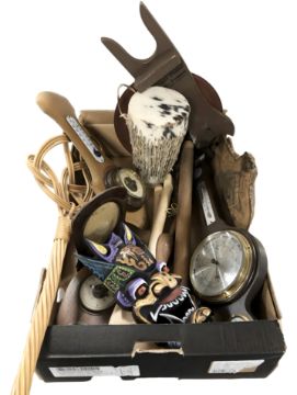 A group of barometers and treen, hide covered drum, eastern decorative mask, carpet beater, etc. (1 box)