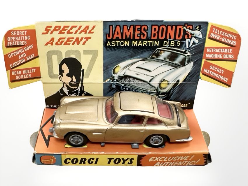 A Corgi Toys 261 James bond Aston Martin DB5 from Goldfinger, with Bond and baddie within, secret instructions, with stand but lacking external box.