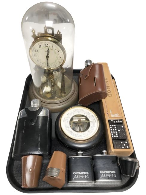 A Hermle brass clock under dome, leather mounted hip flasks and drinking tots, dominoes in box, circular barometer, etc.