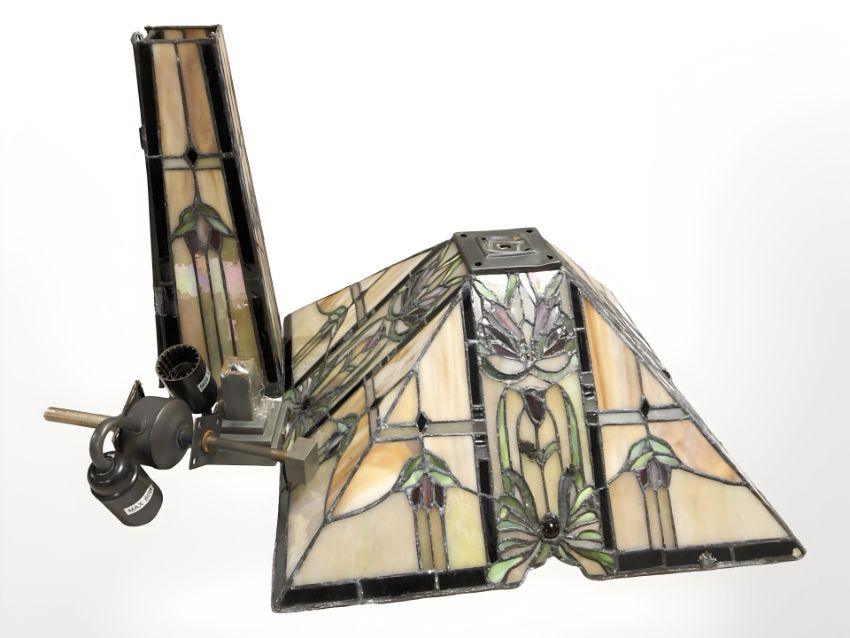 A Tiffany style leaded glass lamp base, together with a vintage mirrored bathroom cabinet, width 37 cm.