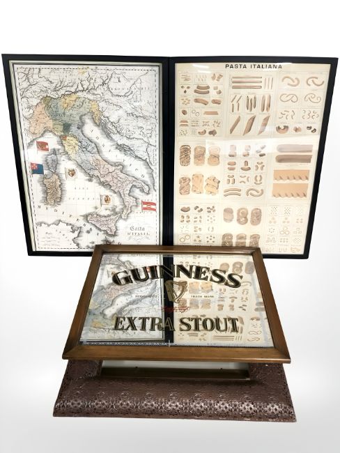 A Guinness advertising mirror, width 61 cm, a further pierced metal mirror and two lithographs depicting types of Italian pasta.
