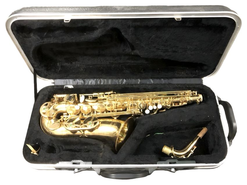 An Elkhart Series II saxophone, with mouthpiece and travel case.